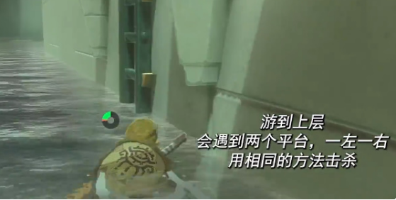 4、完成首轮清剿后,沿水体边缘潜游至建筑背面,攀爬石质阶梯可进入上层区域,注意观察水面反光定位落脚点。